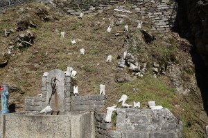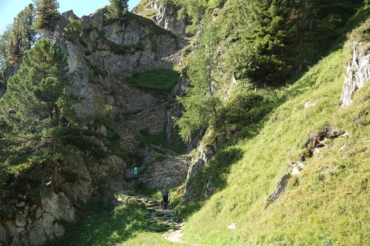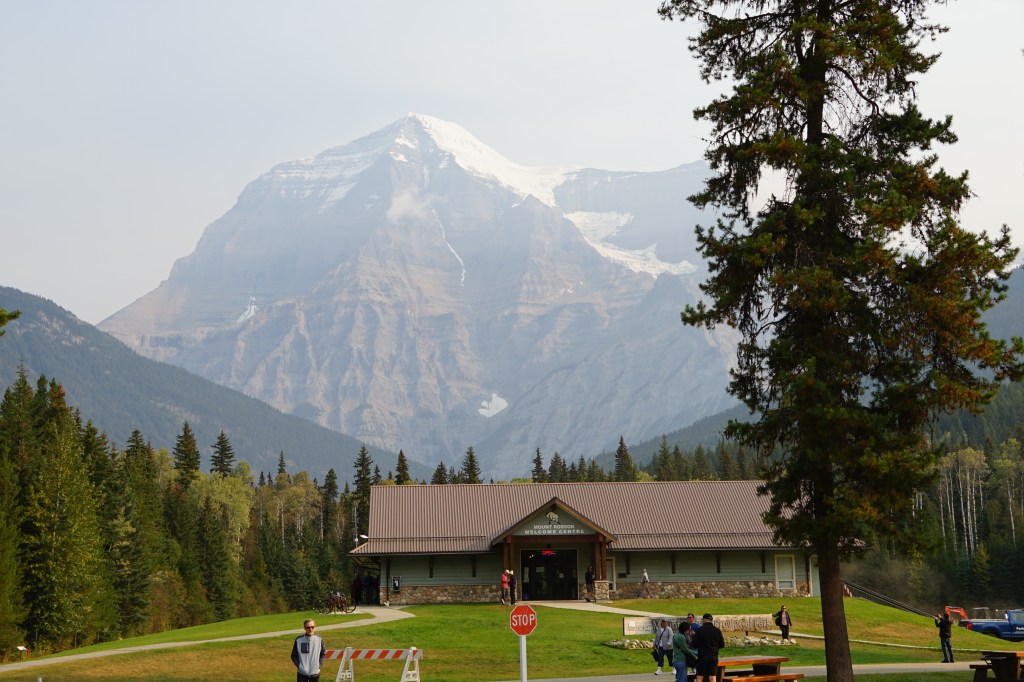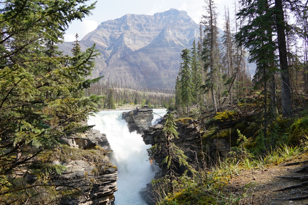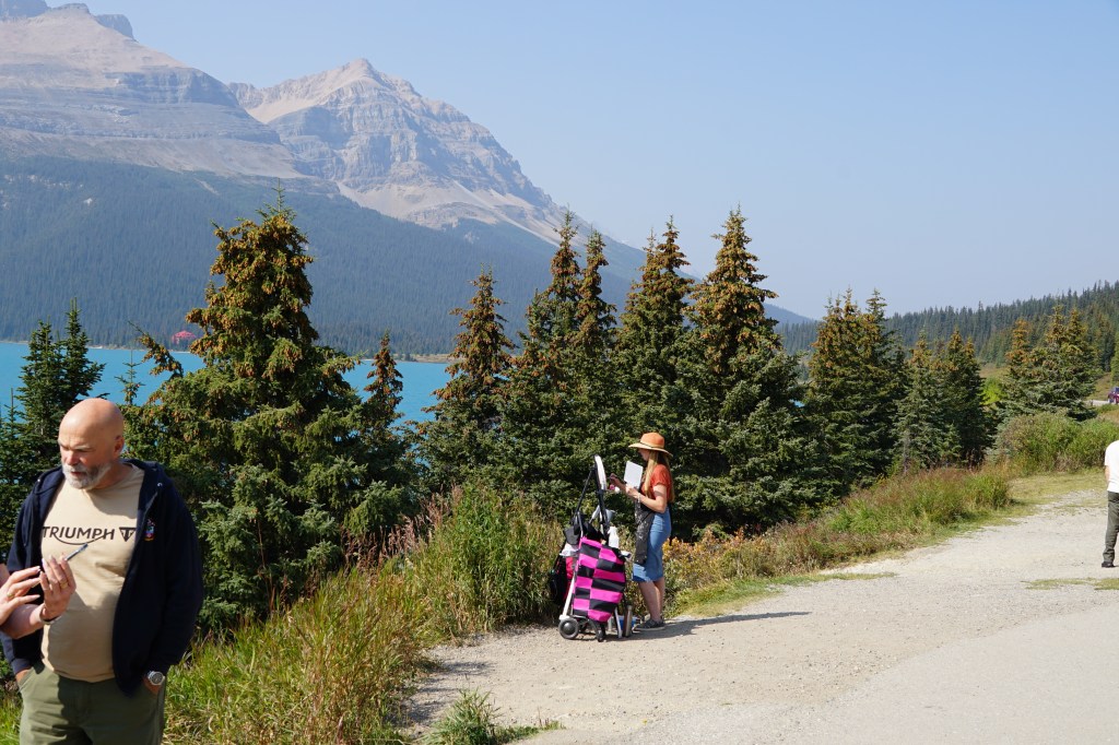 Nachdem wir zufällig das Glück hatten, einen Güterzug durch die Kehrtunnels fahren zu sehen, ging es weiter zum Takakkaw – Wasserfall, es soll der dritthöchste Fall Kanadas sein. Schon die Fahrt hoch war ein spezielles Erlebniss, gibt es doch zwei Kurven, welche längere Autos nur mit Hin – und Herfahren wie eine Spitzkehre schaffen. Autos mit Längen über 8 Meter schaffen diese Stelle nicht mehr. Der Wasserfall ist recht beliebt, so trafen wir auch ein Brautpaar an ihrem Hochzeitstag auf dem Wanderweg zum Wasserfall. Das Schuhwerk des Paares war nicht so geeignet für diesen Wanderweg, trotzdem strahlten beide. Hoffentlich sind ihre Fotos gelungen. Der Führer erzählte uns, dass man oft Kletterer sehen könne, welche die Wand beim Wasserfall besteigen. In der Tat sahen wir zwei Personen, doch die Kletterei scheint nicht so schwierig gewesen zu sein. Als wir die Kletterer entdeckten, schienen sie eine knappe Seillänge Distanz voneinander zu haben. Der erste Kletterer querte überraschend schnell auf einem Band die Wand und die Distanz zur zweiten Person nahm laufend zu. Plötzlich verschwand die erste Person, indess die zweite langsam querte. Knapp eine Minute später sah man plötzlich die erste Person weit oberhalb der zweiten Person wieder, die Distanz nahm laufend zu und betrug schon mehrere Seillängen. Ich gehe deshalb von der Annahme aus, dass die Felswand nicht so schwer zu durchsteigen ist und vermutlich auch einen gesichterten Steig hat.
