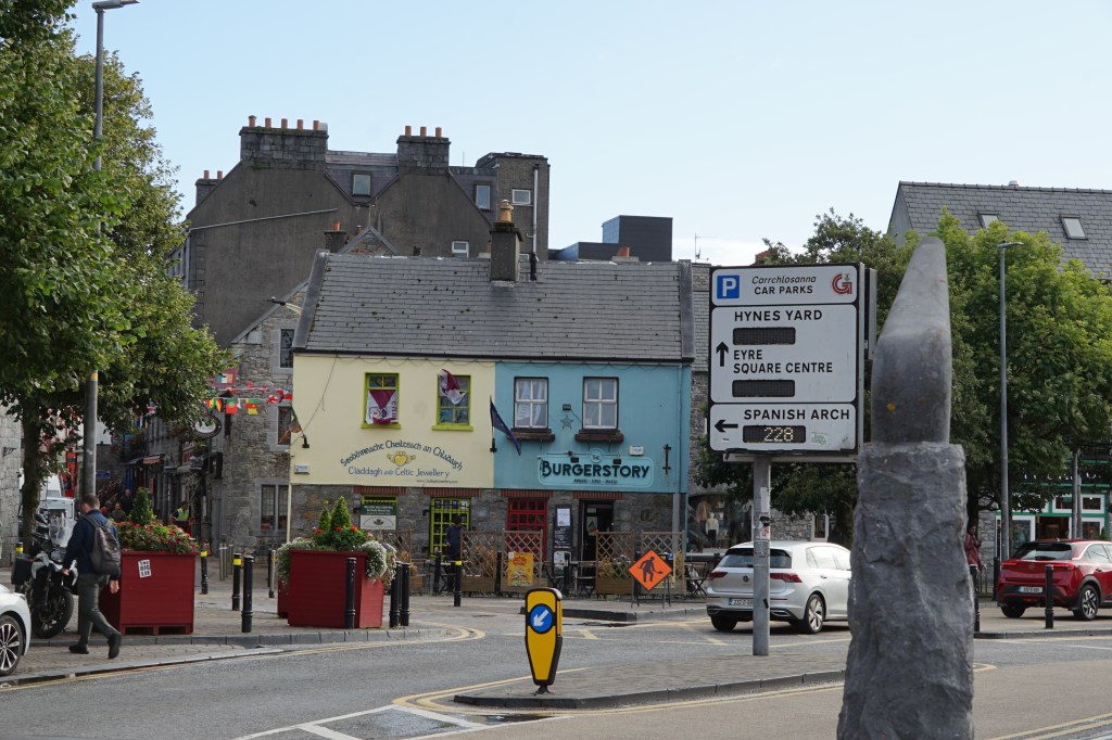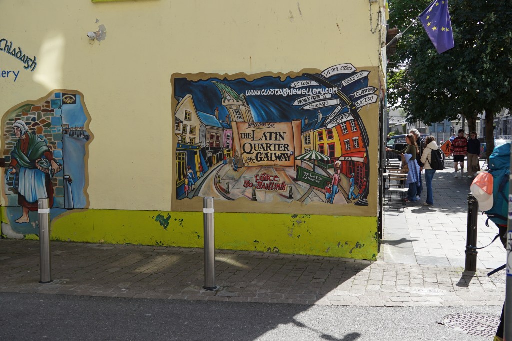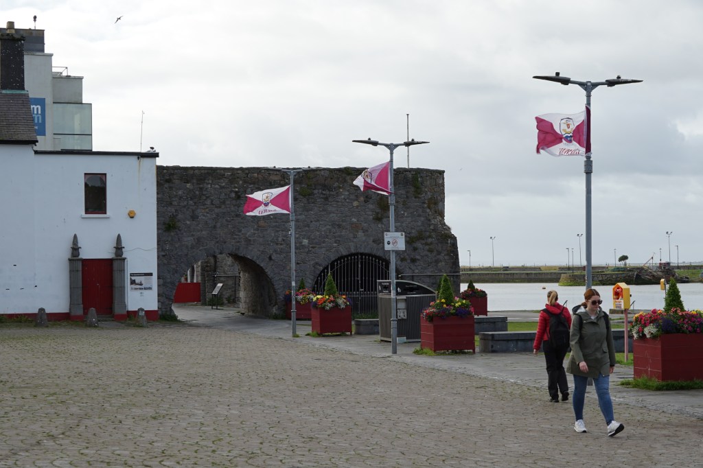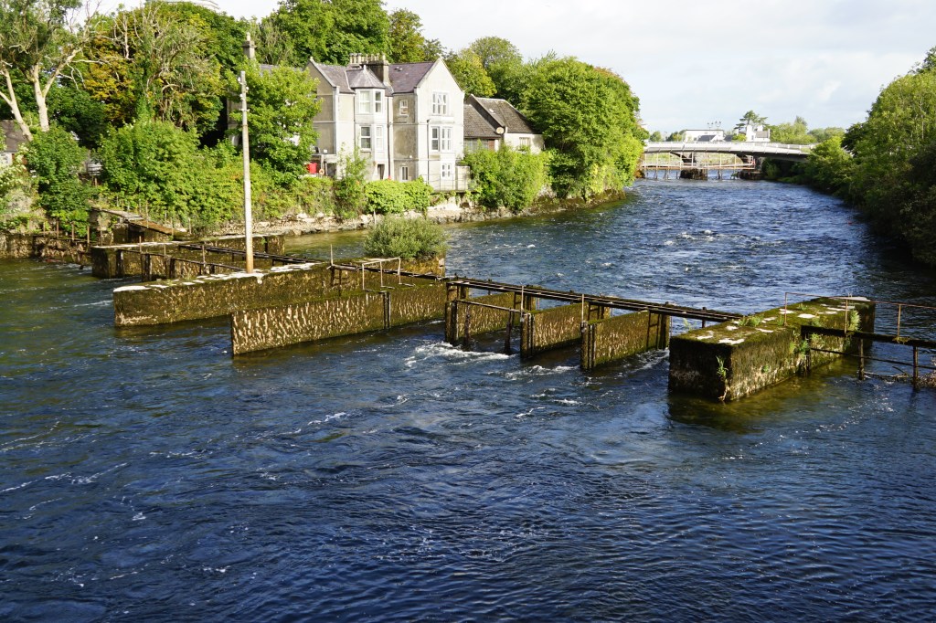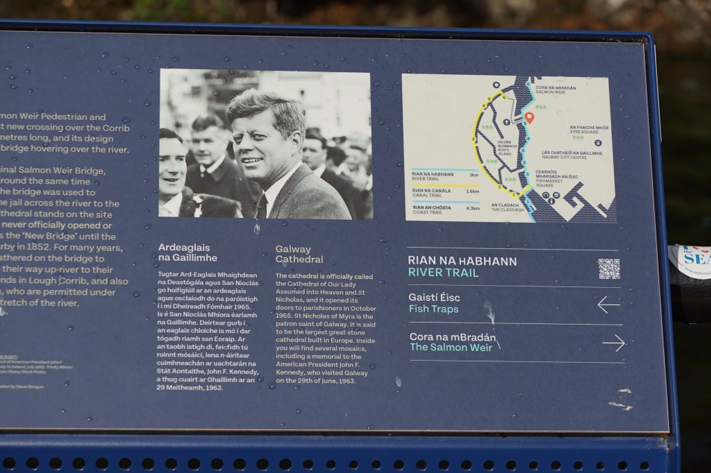Beim spanischen Bogen, dem alten Hafen Galways betrat ich die Stadt. Erst wanderte ich einem Flüsschen entlang bis zu einem See. Erstaundlich viele Hinweise über Auswanderer, welche ihre Not in Amerika zu vergessen suchten. Auch die Familie Kennedy stammt aus der Gegend. Am Flüsschen befinden sich noch alte Fischerstege, von wo man Lachs fischte.