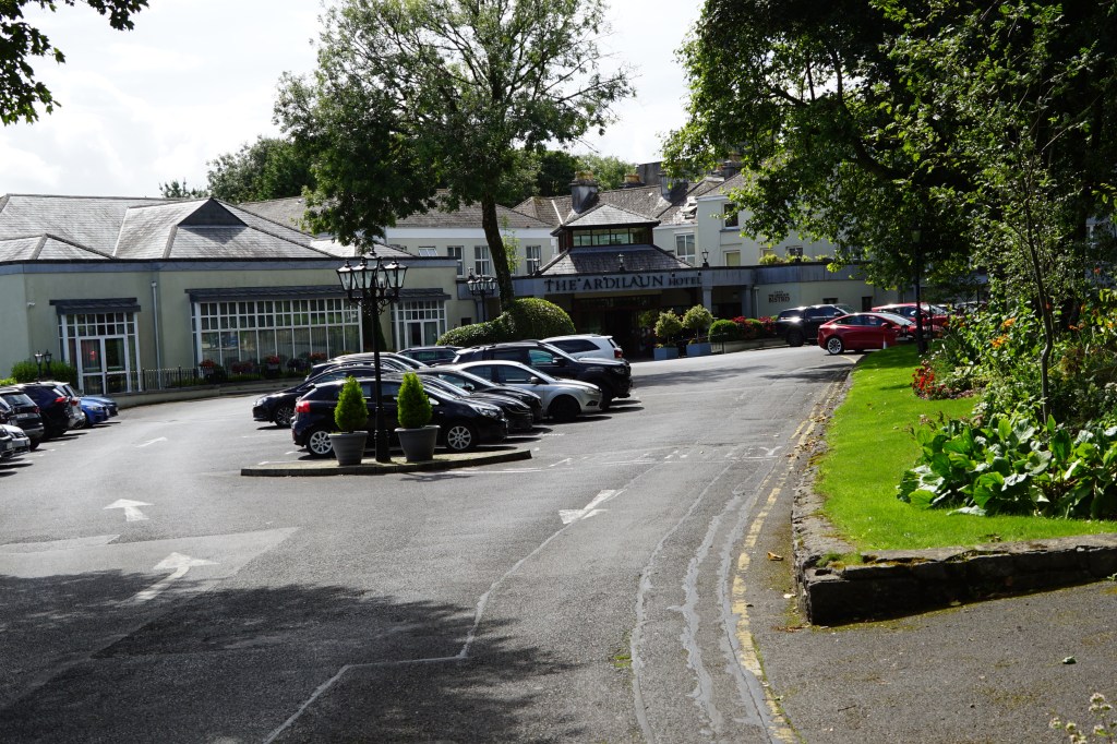 Im Bus war freie Sitzwahl und er fuhr weg, obschon nicht zum letzten Platz gefüllt und andere Passagiere noch warteten. Er war mit Galway direkt angeschrieben, doch erst fuhr er nach Dublin hinein, wo noch einige Passagiere zustiegen. Hier das selbe, noch immer warteten Personen auf einen freien Platz im Bus. Nach der Stadtrundfahrt in Dublin ging es auf die Autobahn und nun Nonstopp in die Vororte Galways, wo erst einige Passagiere ausstiegen. Im Bushof wurden wir von einem Taxifahrer erwartet. Eine Person hatte es nicht geschafft, der Fahrer musste mit vier an Stelle der fünf erwarteten Personen wegfahren. Er führte uns zum Hotel The Ardilaun, wo wir eincheckten und unser Zimmer bezogen.